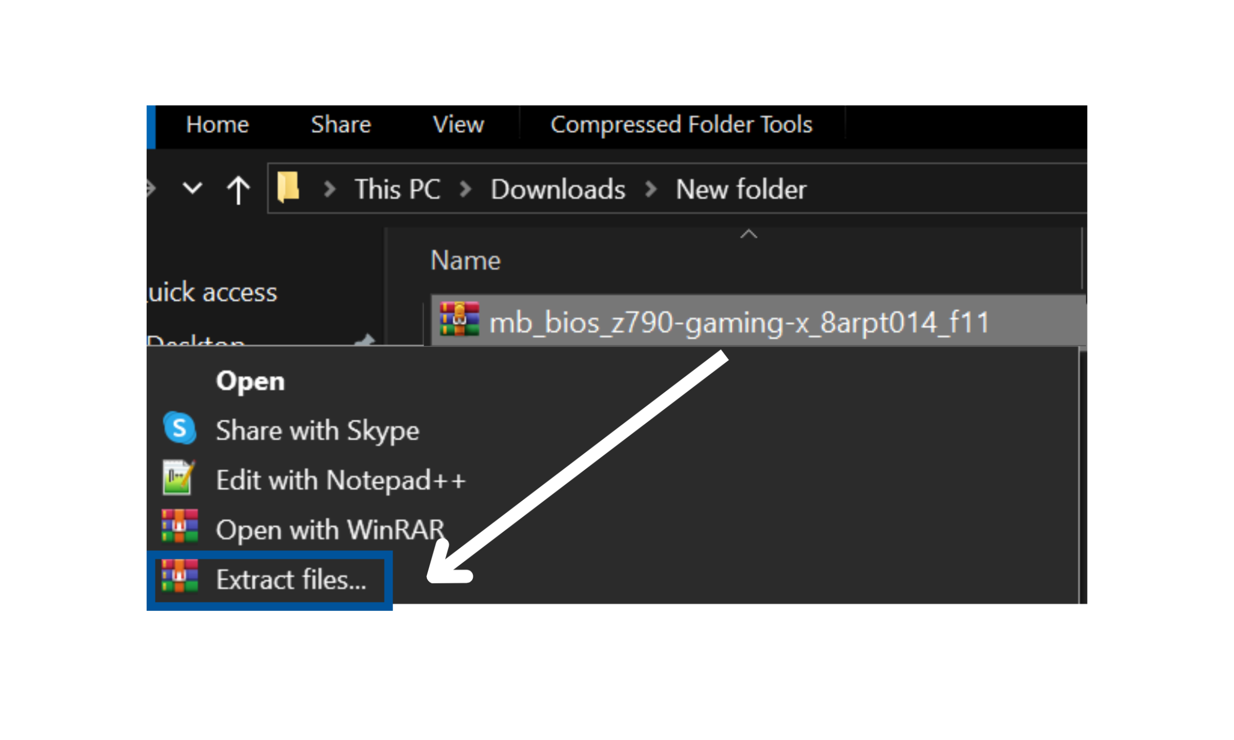 Navigate to the location of the downloaded BIOS file, usually in the Downloads folder (it will look similar to example in the photo). Right-click on the file and select Extract All/Extract Files. This will unzip the contents into a new folder, providing you with the BIOS update file that will be transferred to the USB drive next.